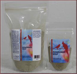 POWDERED KELP is a dietary supplement designed to address iodine deficiencies in birds. Iodine is required for proper thyroid functioning. Iodine deficiencies can result in difficult moults, poor feather condition, breathing and singing problems, inactivity and poor breeding. POWDERED KELP provides the extra dietary iodine needed by Australian finches and eliminates balding in Gouldian finches.